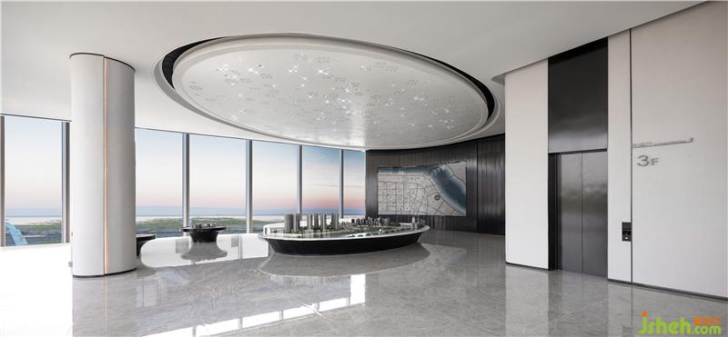 沙盘区的天花选取了桃花元素,并结合现代的处理手法呈现出粼粼波光的效果,在自然光的映衬下熠熠生辉。