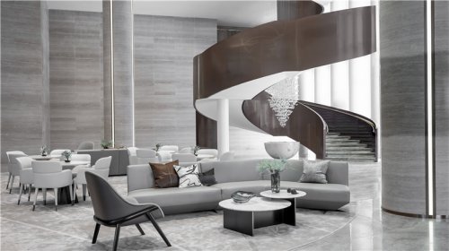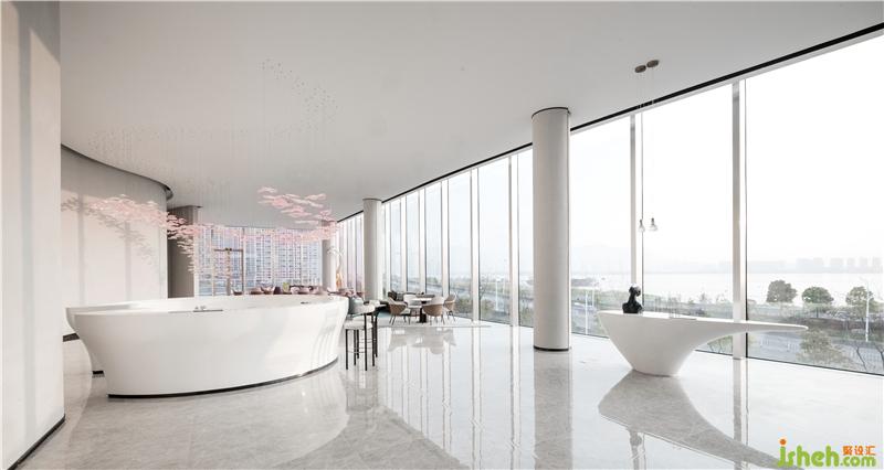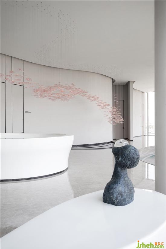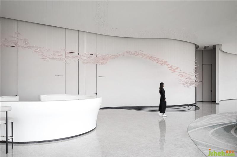 As you step into the front hall, you will see the white reception desk dominated by arcs. The background wall like a big wave gradually climbs up with a strong rhythm.