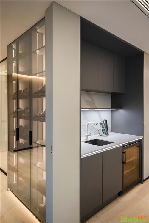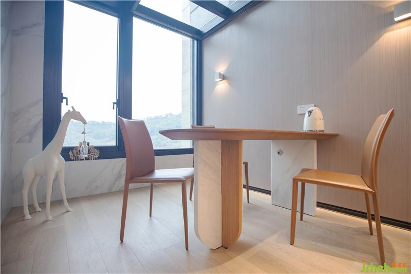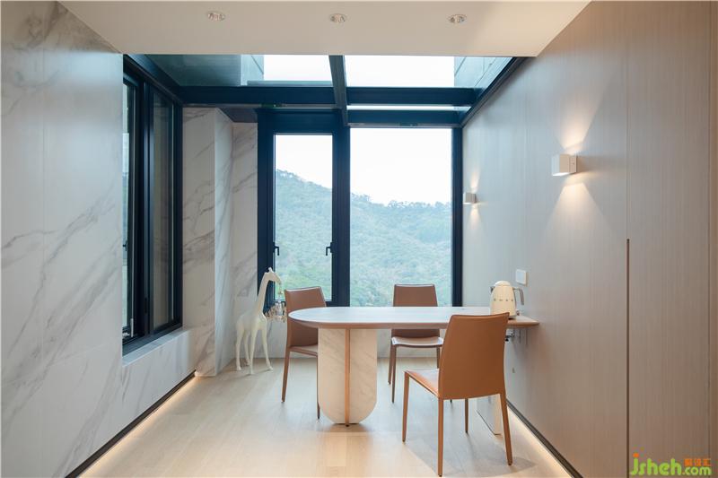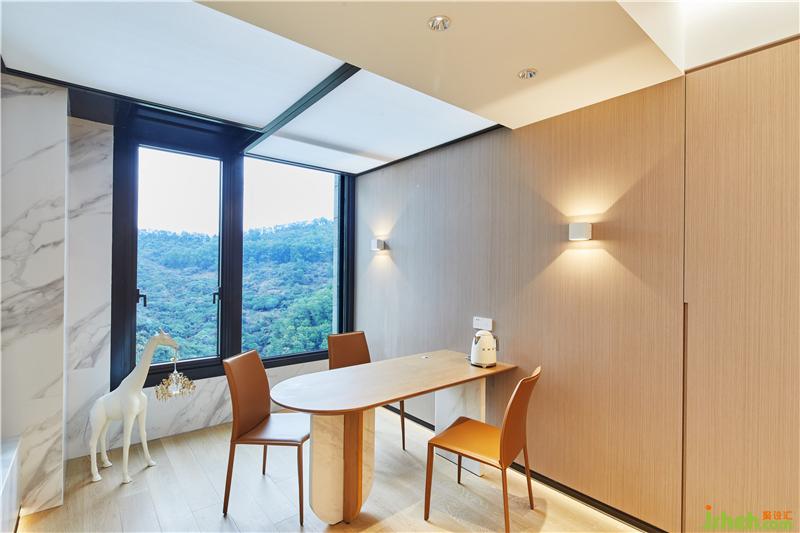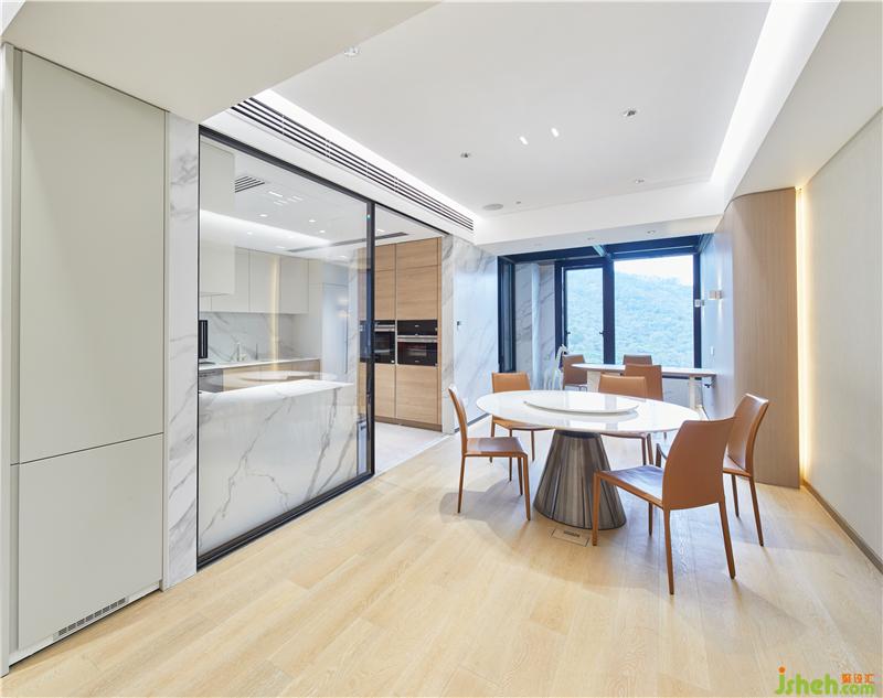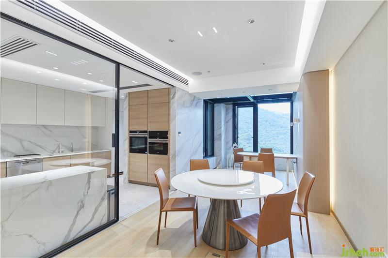 集汇设计将其厨房与餐厅贯穿通透、让就餐空间更加现代和更开阔的视野用餐环境。深圳装修设计山景相依,天然的材质、休闲的属性体现现代格调的高雅