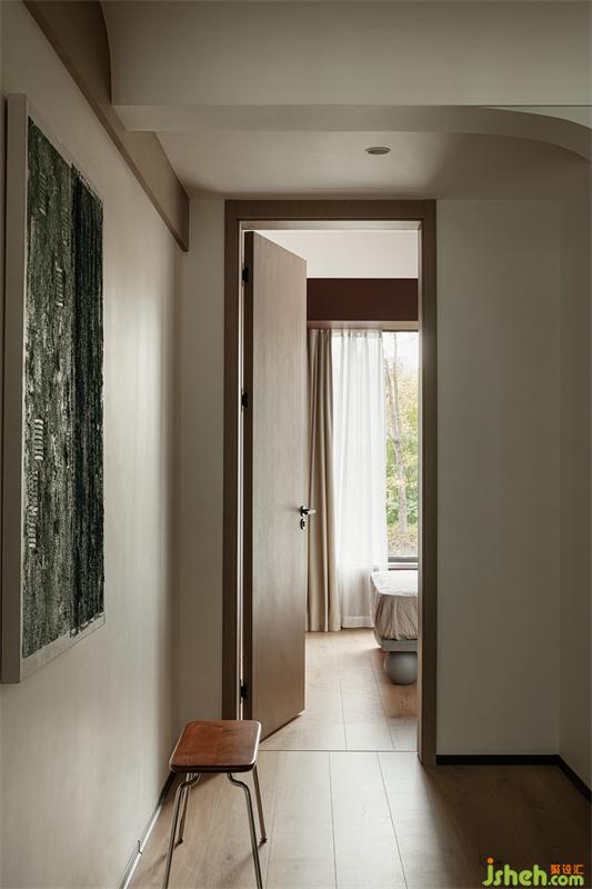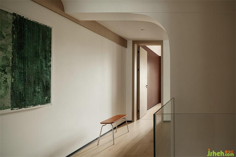 The owner requested to retain the building stairs, and the original structural space was narrow. The designer used glass handguards to extend the vision. The original beam position of the aisle has been modified in arc, and the interspersed structure makes the vision not boring.