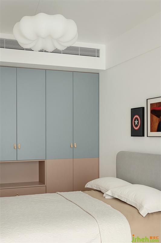 Candy-colored children's room is warm and childish. There is a space on the outside of the wardrobe that is convenient for children to store alone.
