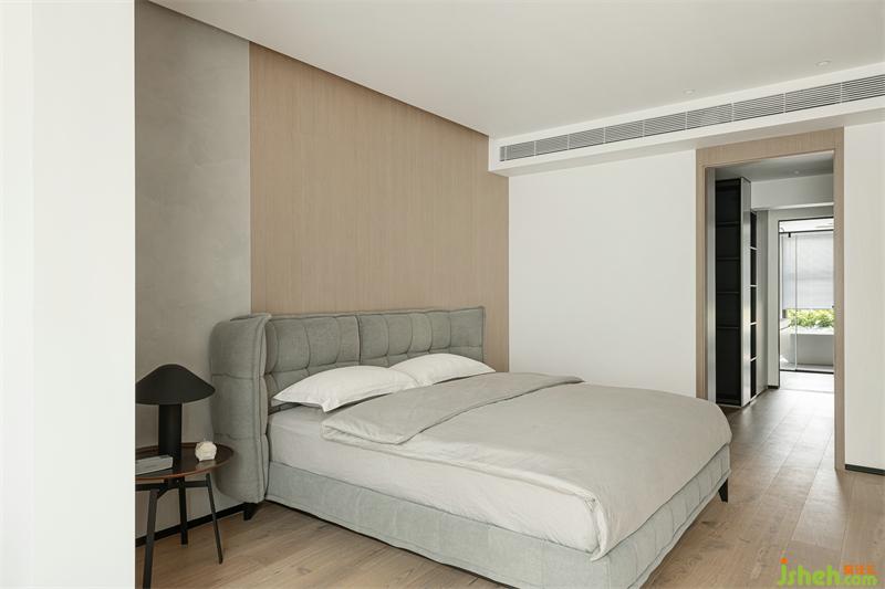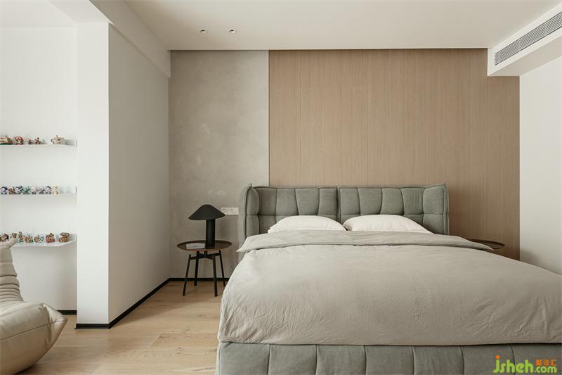 卧室是需要舒适至上的空间,我们在材质本身的质感上做了挑选,布艺靠背床、木质饰面、浅色艺术漆共同塑造了静谧、温馨之感。