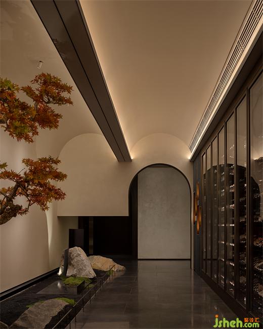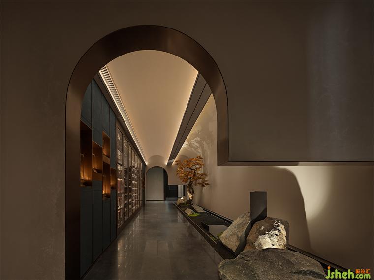 步入拱形走廊,江南满携烟雨气息的风便迎面拂来,古典园林的传统造园技艺被设计师注入空间,两端的弧形拱门展现出独属于文化古国的礼制气派,奇崛古朴的太湖石与大型景观相互映衬,山水之意、造园之情从枝叶石砾中自然蔓发,大写意园林的意蕴情致自设计细节处盈盈满溢。