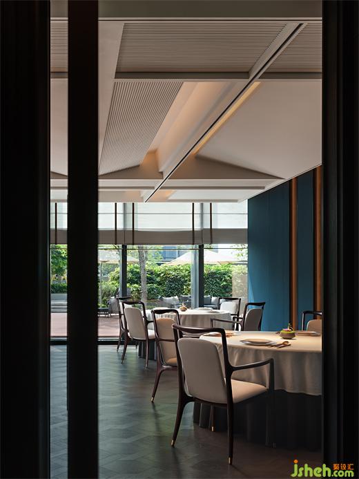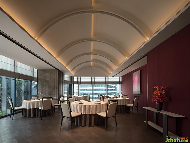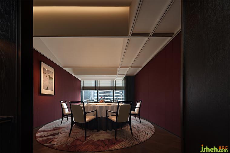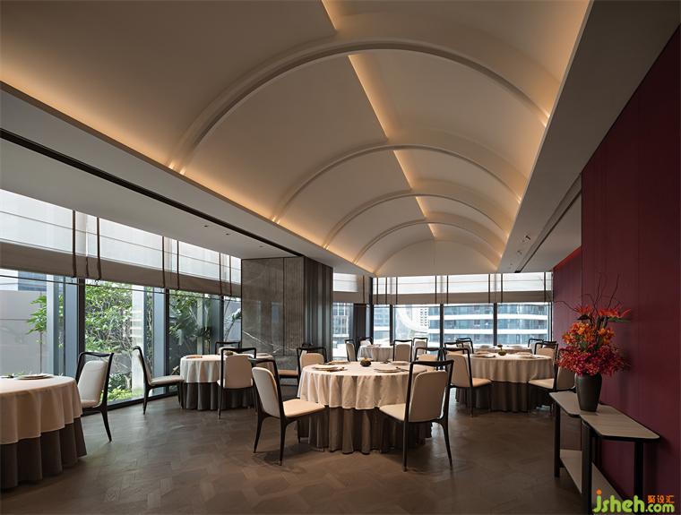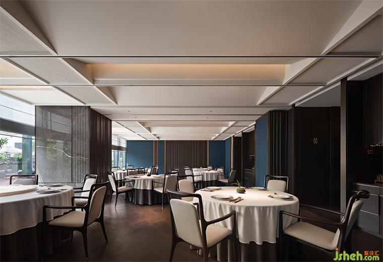“江南好,风景旧曾谙,日出江花红胜火,春来江水绿如蓝……”如若以色彩描绘江南、以物象诠释江南,那么朝晖的红、荻花的白、蓝草的靛便是江南丹青中不可或缺的元素。设计师汇集水墨画作中经典的黛青、素白、墨灰、赤金……多元色彩的和谐共存,餐厅设计同绘出客座空间文集雅宴的隽永气度。