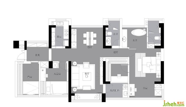 △公卫设计从实用的角度出发,精简的洁具,与客餐厅呼应的浴室柜,墙上的壁龛,玻璃门的隔断...设计源于生活,也用于生活。