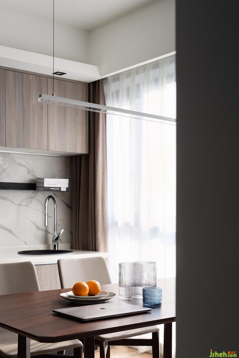 △西厨的橱柜上不仅配有水龙头,还有搁板、隐形灯带,从便利的角度出发,全方面的照顾到生活习惯。特地选择与餐边柜色彩相近的餐桌,这样可以形成视觉上的统一。