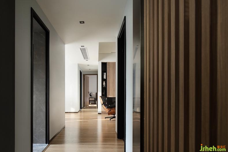 △过道过于狭长,干净的布局可以让走道更为宽敞明亮。在走道起点设计木格栅,丰富走道的艺术效果。