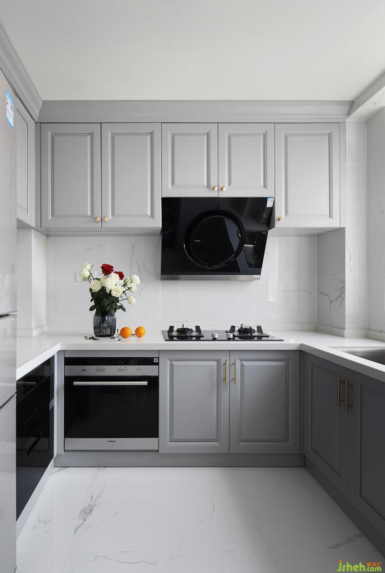 △再少不能少储物,所以靠墙打造了整排的橱柜和吊柜,同时设计了上下水,可以用来做西厨。橱柜造型与墙面遥相呼应,让整个餐厅格外的和谐。