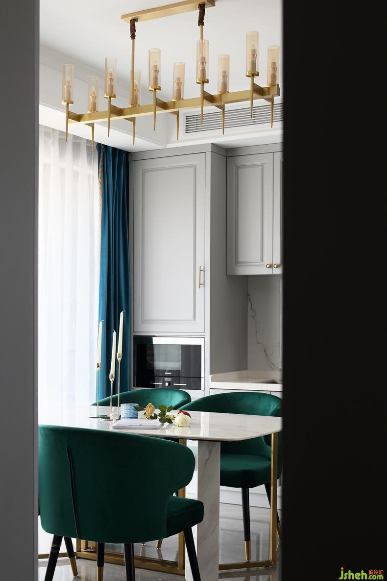 △墨绿丝绒+黄铜吊灯的组合,瞬间提升空间档次,弥漫出浓烈的复古腔调。
