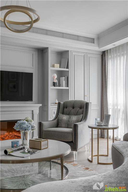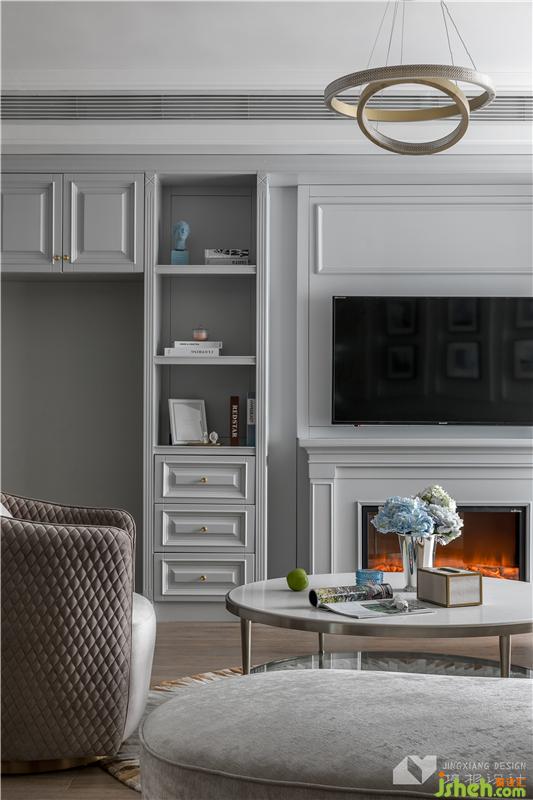 电视背景墙则兼并了颜值与实用性,多种柜体组合满足屋主的书籍杂物存放。女屋主十分喜欢壁炉,所以在电视机下方设置了仿真壁炉。横平竖直的石膏线条十分流畅,透出些不凡的气质。