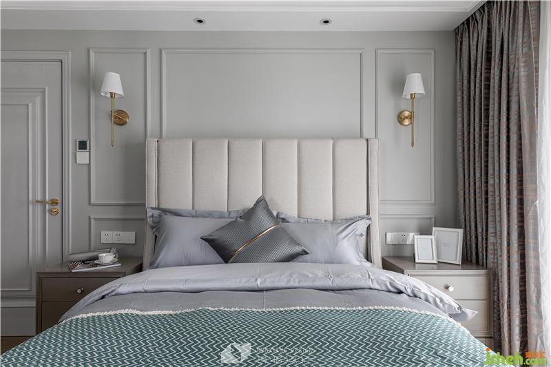 双人床的床头较高并且本身就富有腔调,所以背景墙上就没有做过多的设计。壁灯、线条刻画出对称美,又利用床头柜的不同色彩打破这种对称,找到二者之间的平衡。室内设计师
