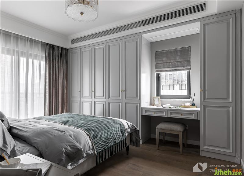 依旧利用石膏线条打造简洁感,优雅的法式双人床舒适宜人。靠墙是整排通高的柜子,柜门的造型与墙面的线条相呼应,形成视觉的统一。预留出大量的空间,专门给宝宝的婴儿床留位置。