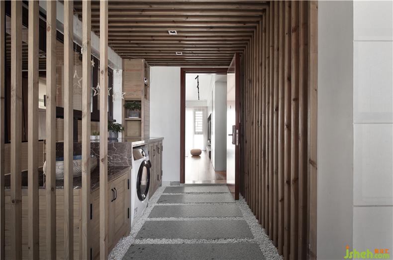 入户花园无法并入室内,室内设计师于是将其改造成洗衣房,包含洗衣机干衣机面盆。在挨着门口的地方打造鞋柜,用来收纳日常换下的鞋子。