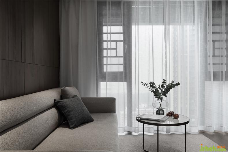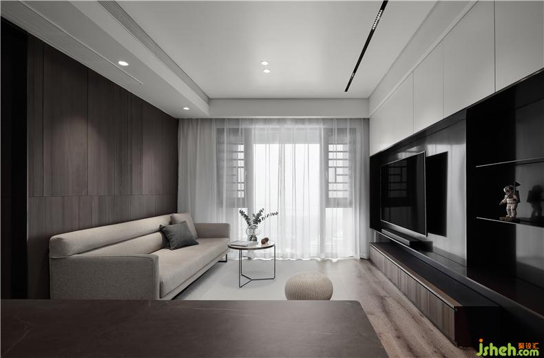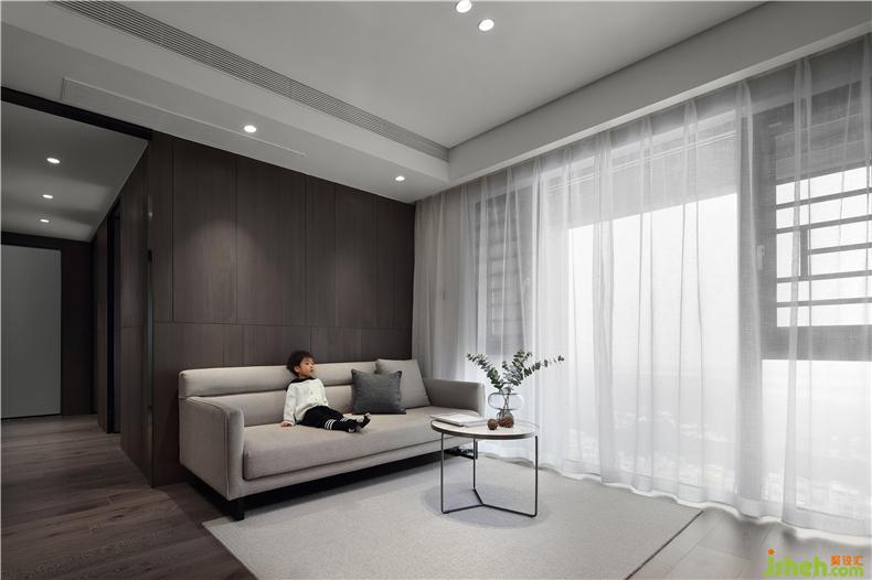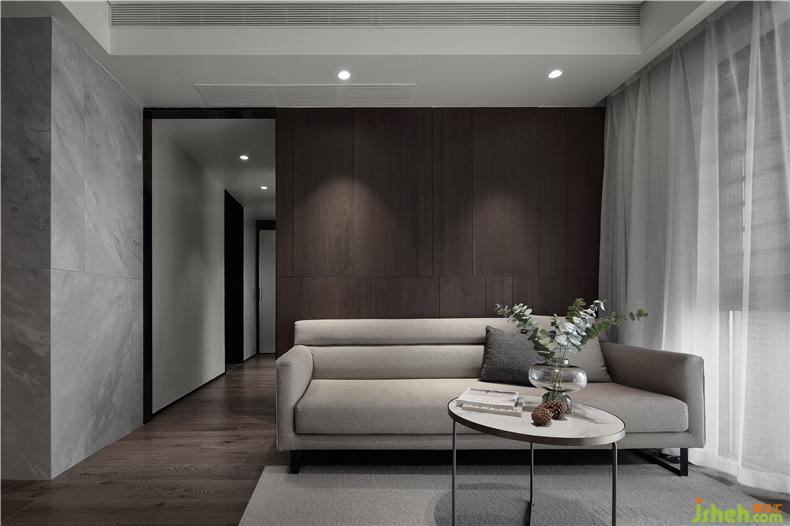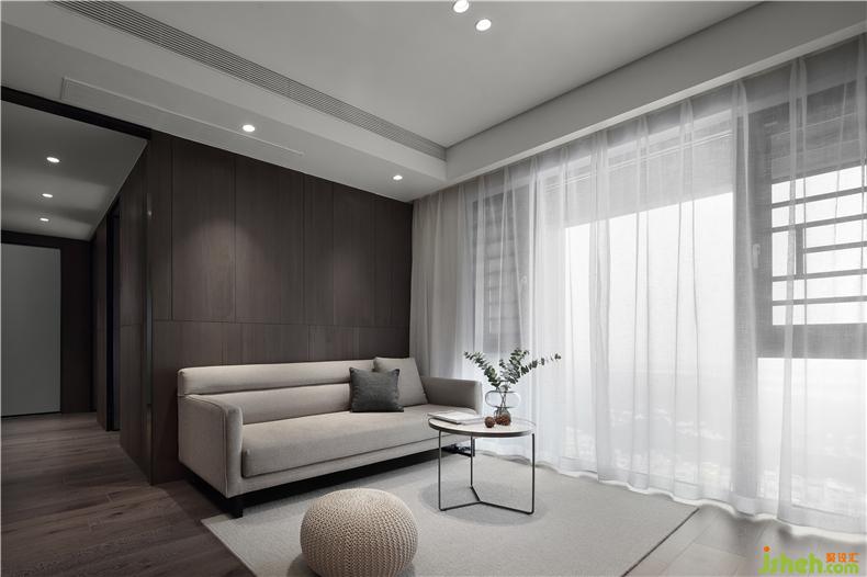 沙发背景墙用木色的免漆KD板,铺垫出全房的简约基调,干净环保。室内设计师