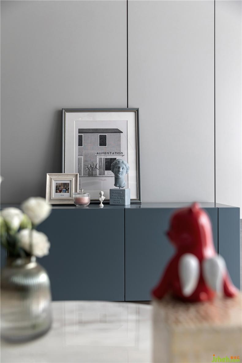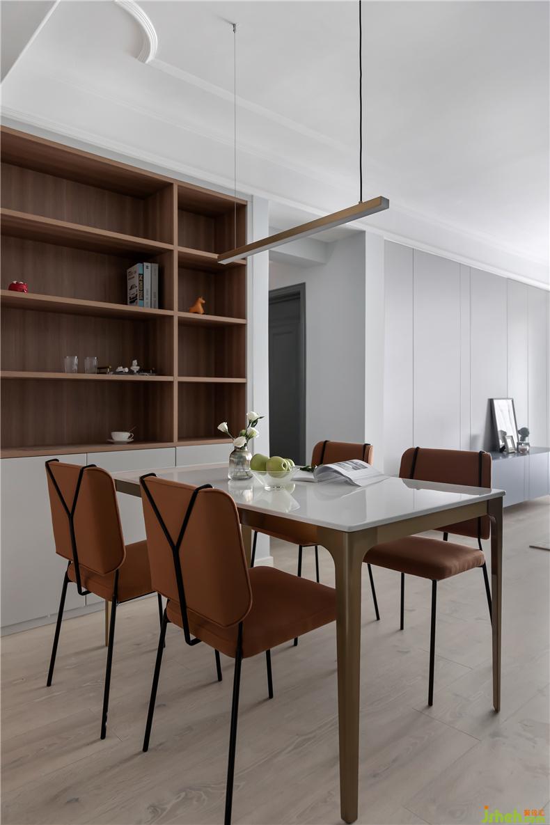屋主在家做饭的次数屈指可数,室内设计师所以餐边柜一部分用于储备餐厅区域的杂物,另一部分则用于存放书籍,将实用性提升到最大。
