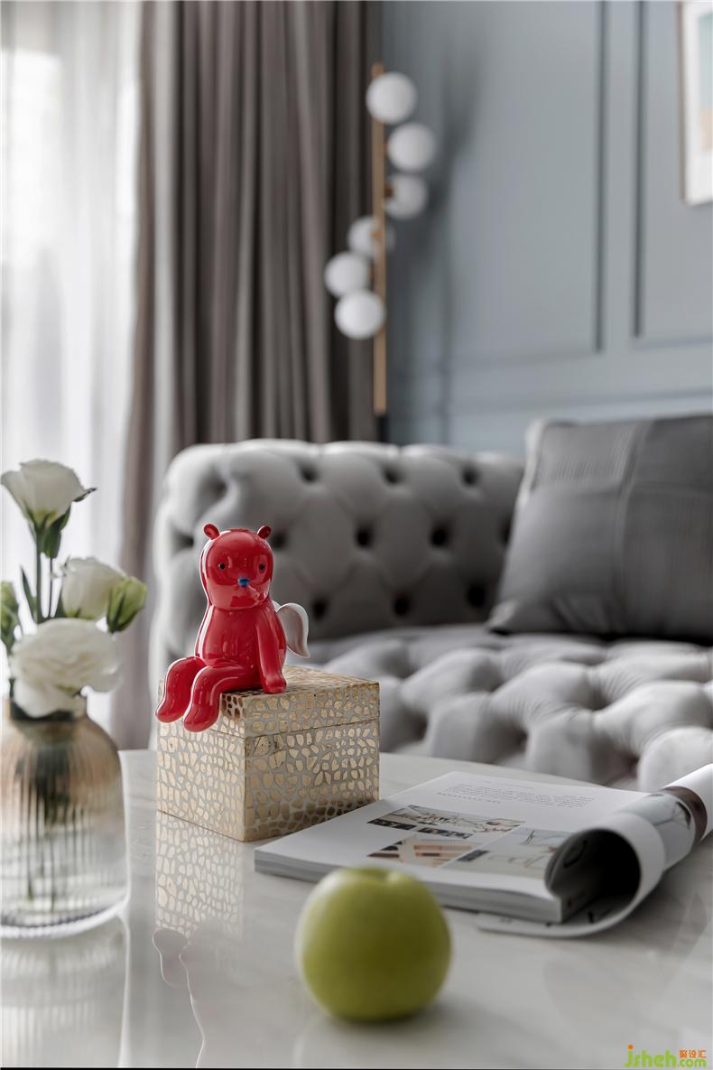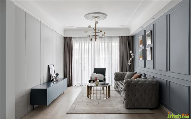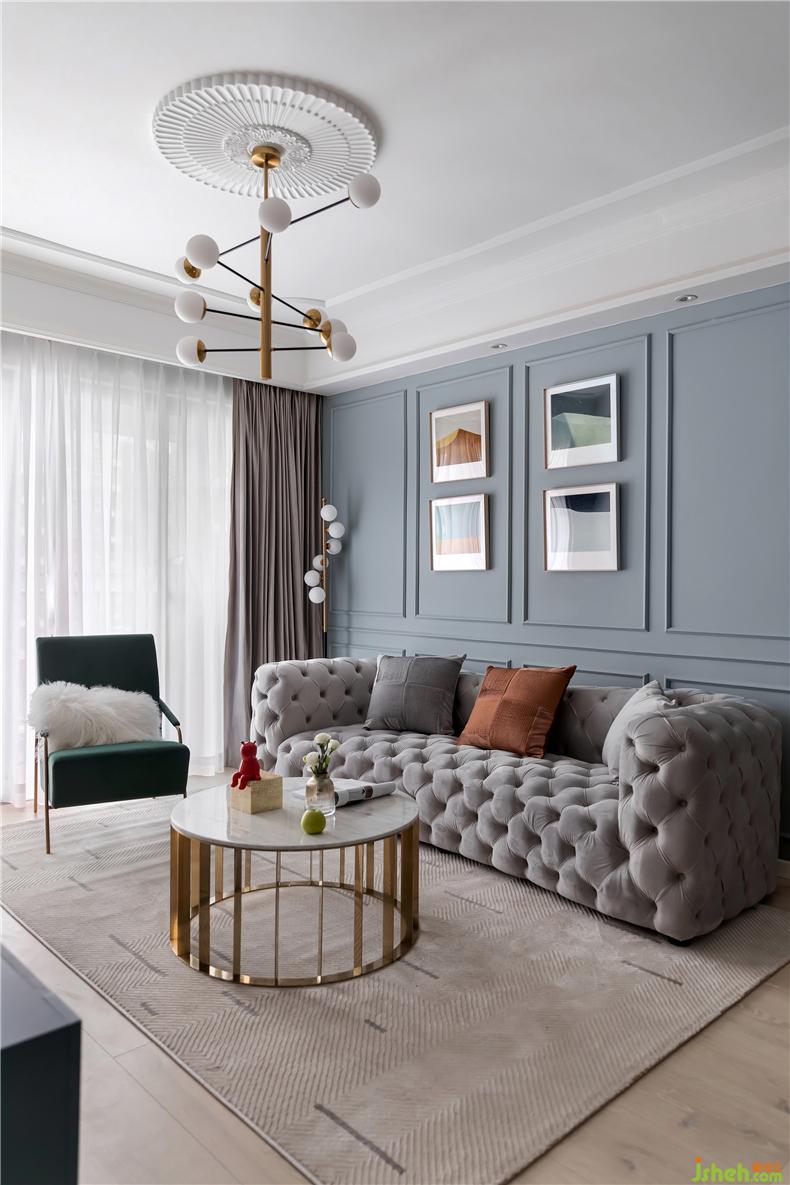 灰蓝色的沙发背景,调性低奢细节丰盈,室内设计师上方设计了嵌入式的筒灯,墙面来几幅挂画装点,夜幕降临华灯初上时,一个有品位的家便映入眼帘。