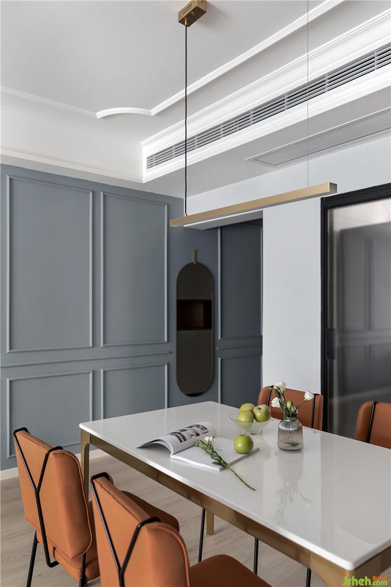 客厅的墙面设计延伸至餐厅,两个空间的联系更为紧密,靠近玄关过道处安放了一面穿衣镜,方便屋主出行前整理妆发,镜身圆润的曲线轮廓和墙面形成互补,让过道处的视觉效果更加通透舒适。