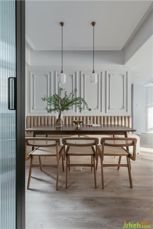 细腿餐桌,释放更多用餐空间,金色脚套,彰显出细节质感。藤编餐椅,令情绪悄然放松,结束一天的工作、学习,一家人围坐吃饭笑谈,便是生活的烟火气。