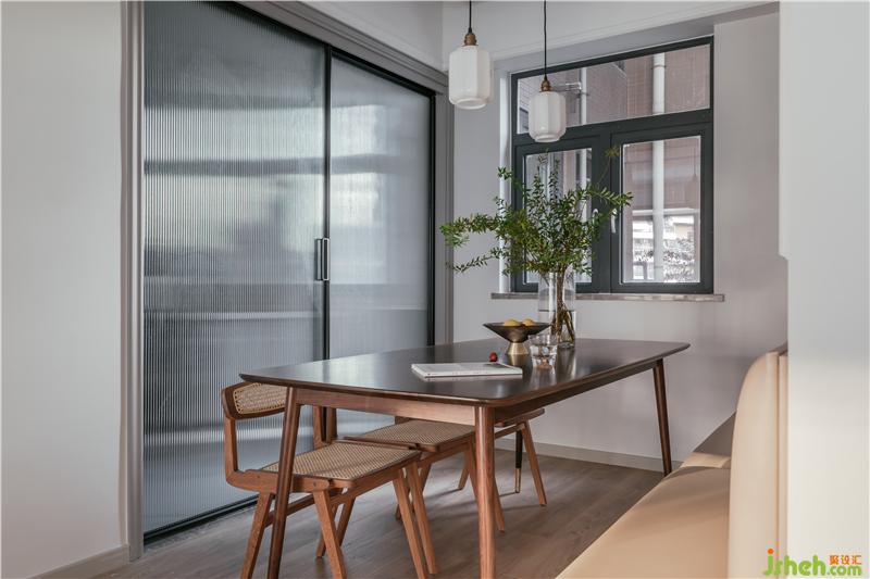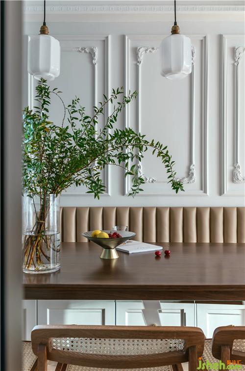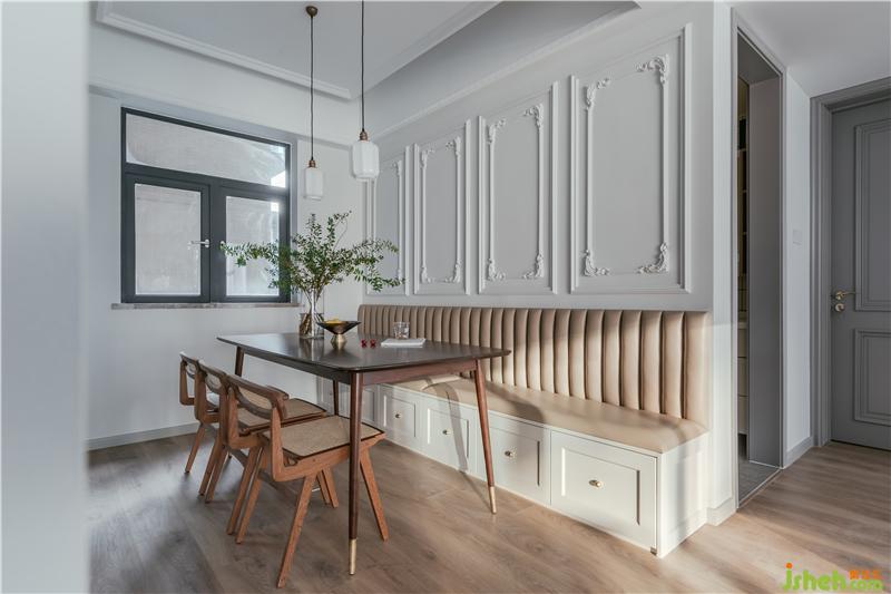 餐厅面积较小,室内设计师采用卡座,让活动空间更充足,同时提供储物空间,贴心的软包靠背和柔软坐垫,提供舒适的用餐体验。