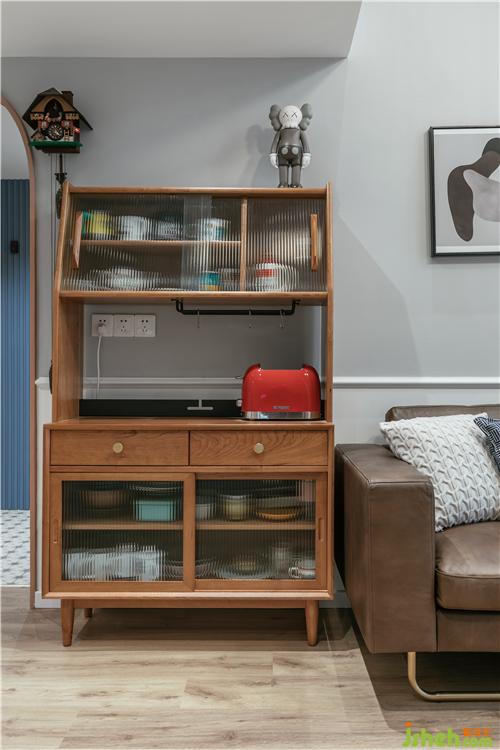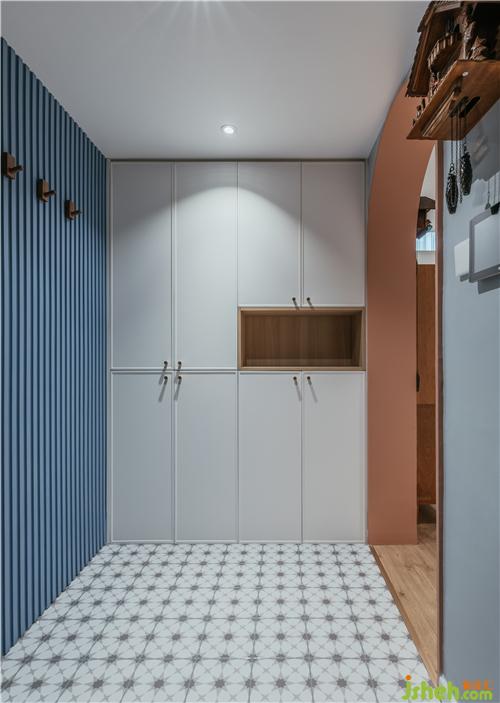 依据原有格局,靠墙增设顶天立地鞋柜,使玄关功能更为齐全,便于日常的生活使用。