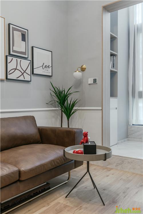 墙面以腰线分割,上半部分浅灰,下半部分纯白,色彩清浅柔和却不失层次感。
