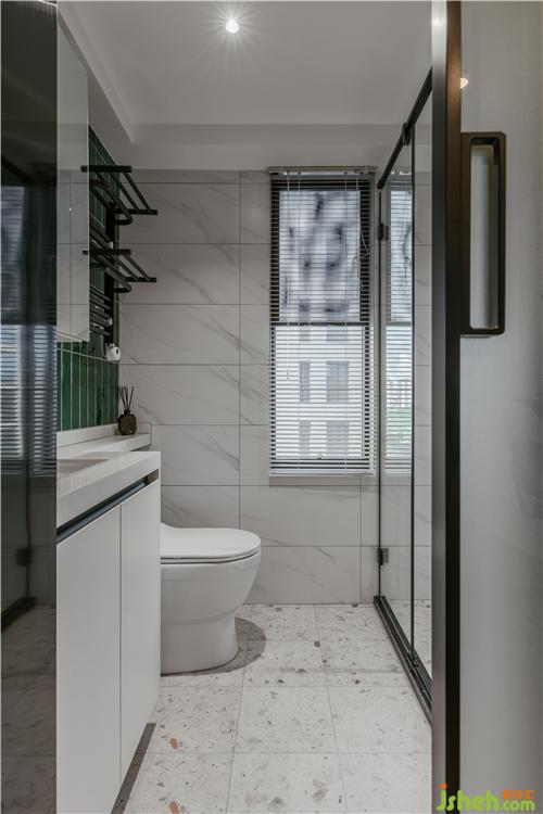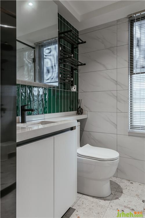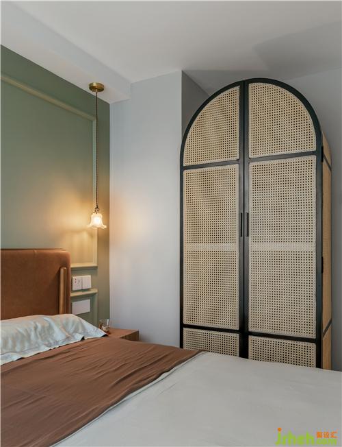 房间墙面采用PU线条和莫兰迪绿色墙漆,搭配黑色铁艺家具,拱形衣柜、暖色光源壁灯,营造出温暖的光影氛围。