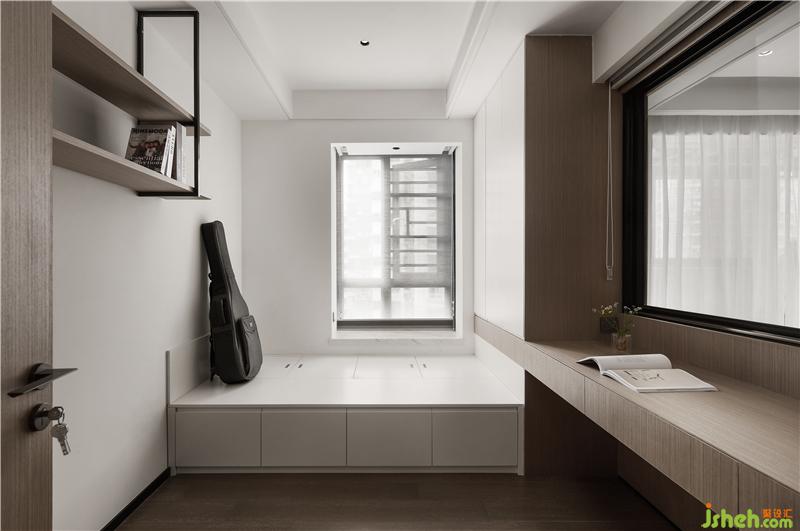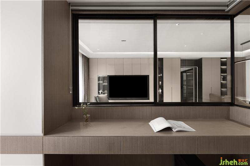 窗前设置悬空的书桌,拉下窗帘,可静心伏案工作;疲乏了,拉开窗帘可看会电视,放松身心。