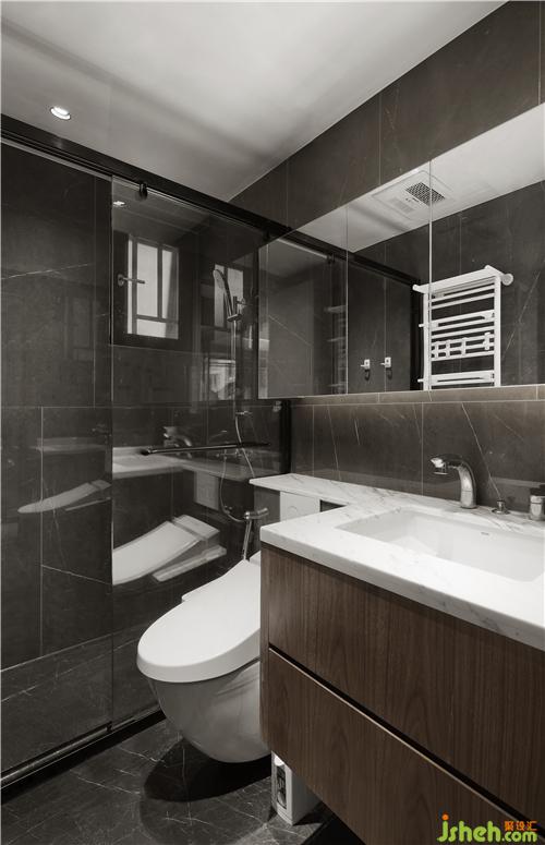 公卫面积不大,但仍设置单独淋浴房,实现干湿分离,黑色纹路大理石地砖,与纯白的卫浴用具,颜色对比鲜明,放大视觉空间。