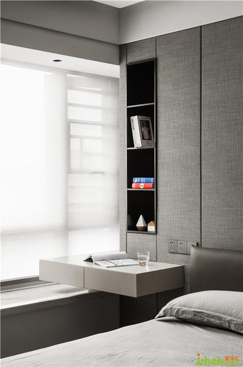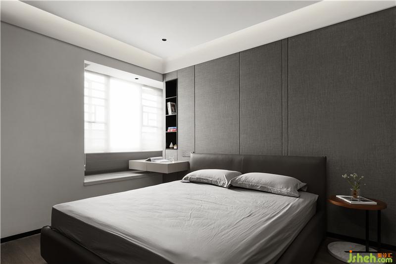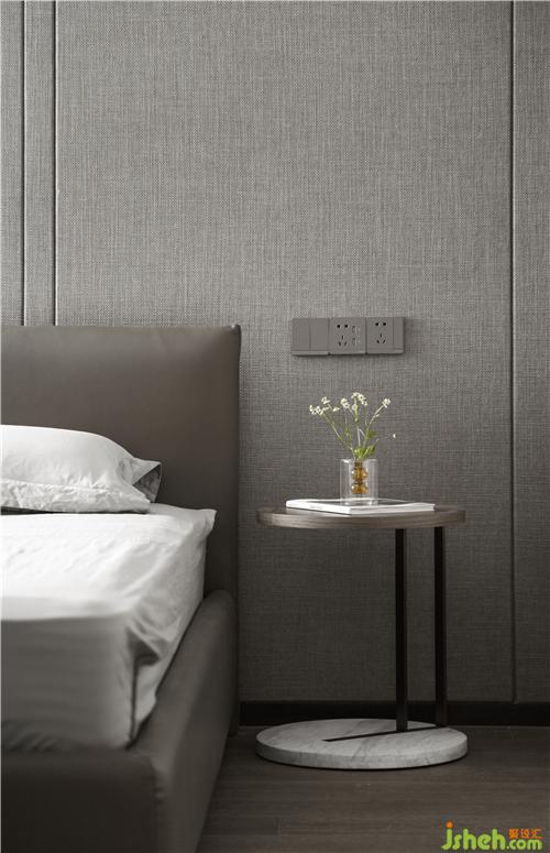 主卧以高级灰为主色调,营造静谧入睡氛围。两侧墙面均选用灰色棉麻墙咔,提升质感。按压式衣柜与墙体深度融合,空间开阔而规整。