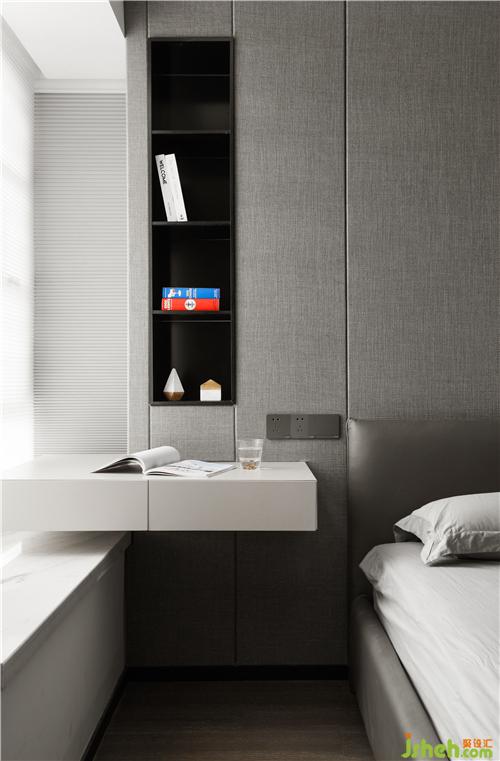 屋主有睡前阅读的习惯,床头右侧装了一面悬空小书桌,左侧添置了一张精致圆桌,充当床头柜,桌上清新的插花,平添几分浪漫情调。