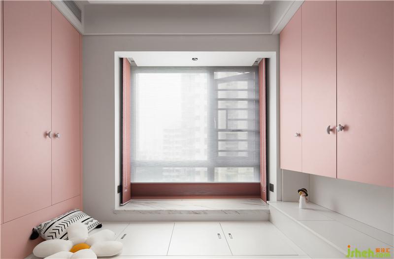 儿童房内,梦幻的粉色与纯洁的白色,默契对话,纯真的少女气息扑面而来,大面玻璃窗,令室内明亮清爽,榻榻米的设计,再一次扩大储物空间。