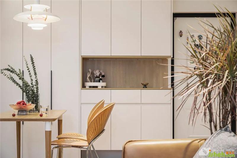 柜体从玄关延伸至餐厅,满足各类物品收纳需求。通高象牙白鞋柜,收纳全家鞋物,搭配极细黑色把手,深圳公寓装修设计大气而时尚。