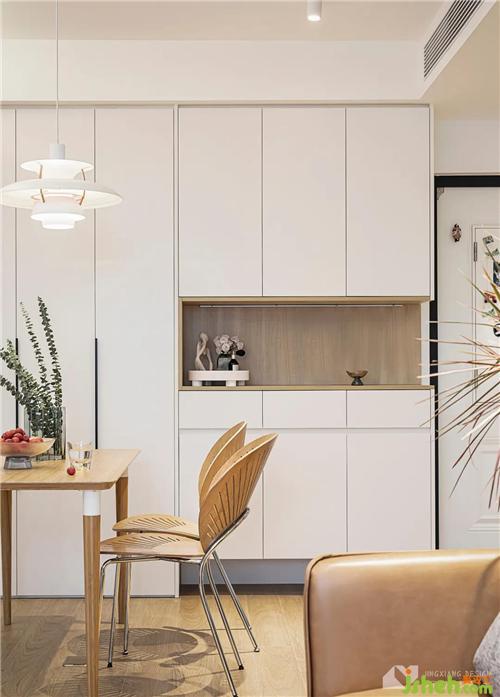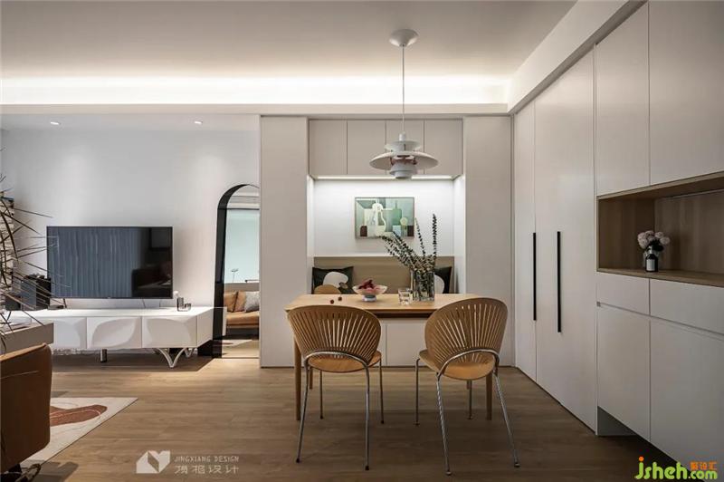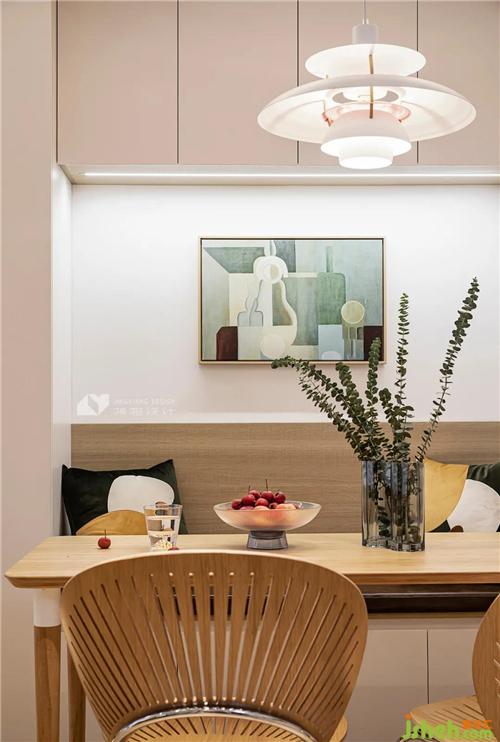 靠墙的一侧,定制卡座,减少空间的占用。上方装有吊柜做收纳,卡座底部也做了储物设计,弥补了餐边柜的功能。