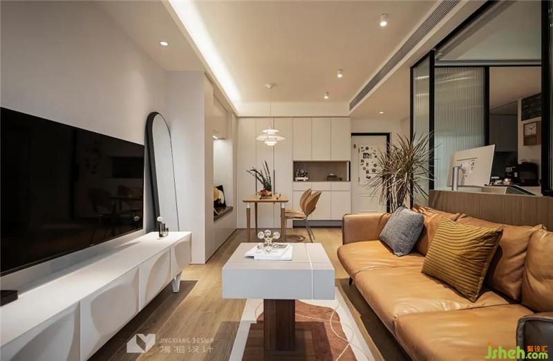 我们打通厨房、阳台,打造开放式大厨房;将次卧改为书房兼客卧,用玻璃门代替墙体,获取充足采光;L型储物柜联动玄关、客餐厅,解决收纳难题……实现60㎡小户型颜值、功能双逆袭!