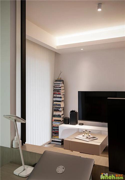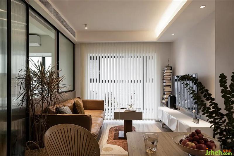 竖型百叶帘分割出客厅、阳台的界限,却不妨碍光线的游走,视觉更宽敞、明亮。