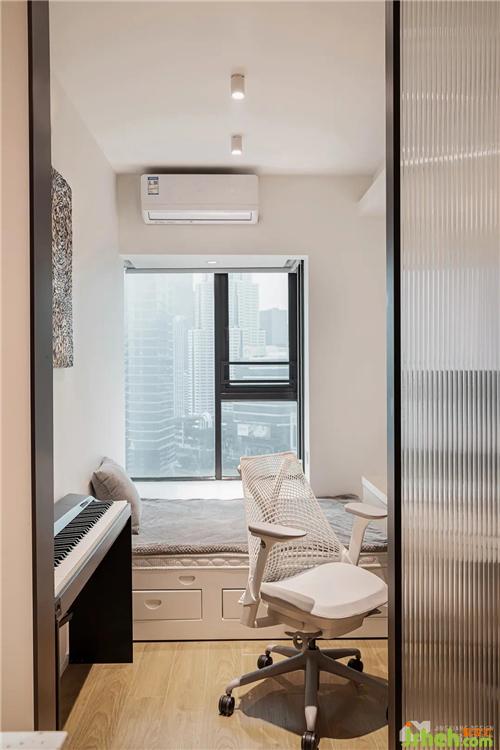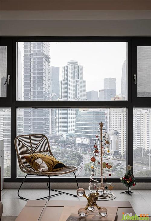大幅落地玻璃窗引入自然光线,藤编躺椅休闲感十足,寒冷的冬日,沐浴着轻暖的阳光,深圳公寓装修设计惬意至极。