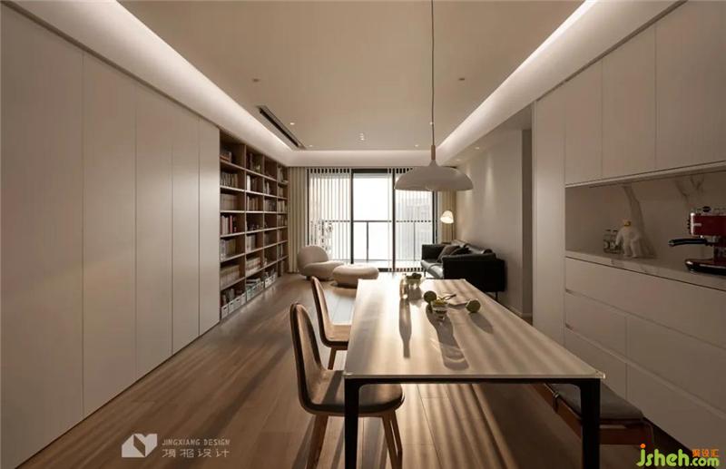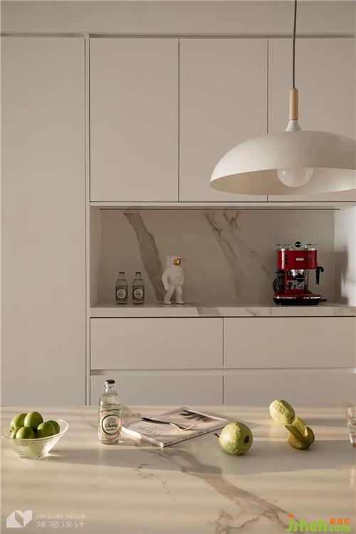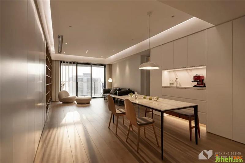 The custom-made sideboard cabinet is hidden and exposed. The coffee machine is placed in the open grid, and the installed light band is convenient for coffee making. A simple chandelier with northern European style above the dining table adds color to the food with light. Every meal is exquisite and pleasant.