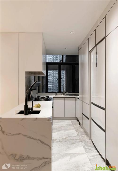 The U-shaped kitchen optimizes the living line. According to the beam reasonable layout of the whole storage cabinet, cover up the space defects, visual more unified. The island table is made of marble, which can be used as a water bar or a western kitchen for cold food.