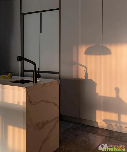 U型厨房优化生活动线。根据梁体合理布置整面储物柜,掩盖空间缺陷,视觉上更加统一。岛台采用大理石材质,既可做水吧台,深圳室内设计师也能做西厨处理冷食。