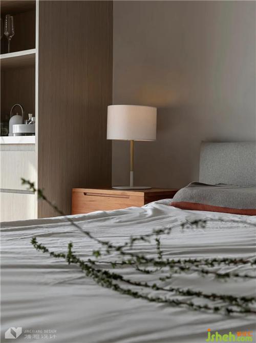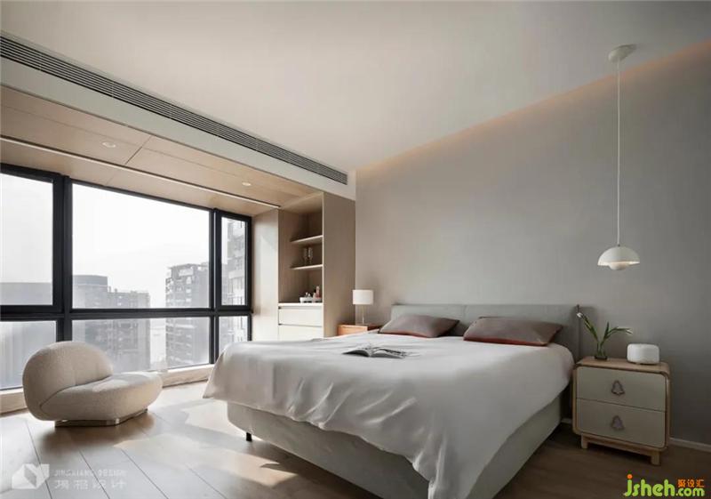 The master bedroom uses white and log color as the main color ,and uses high-grade grey bedding and green plants to reconcile the white emptiness, creating a natural and transparent sleeping space.