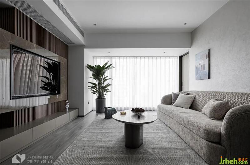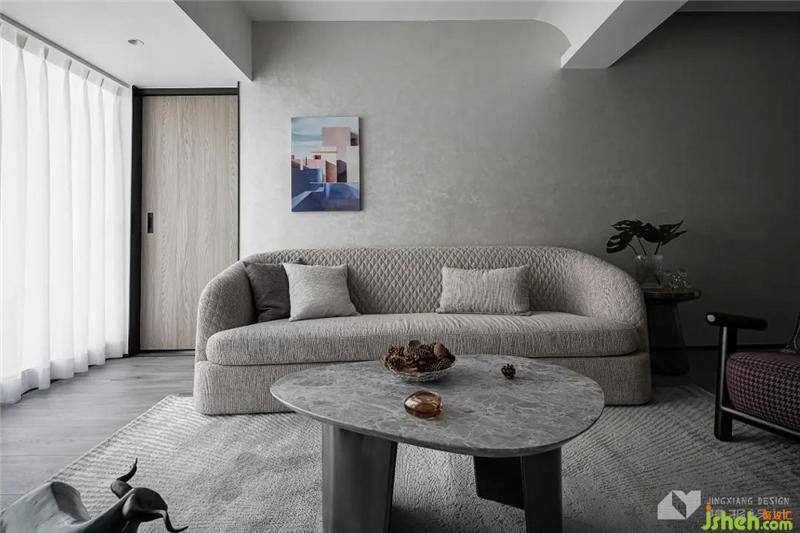 以低饱和的灰白为基调,营造出休闲、舒适的空间氛围,令情绪悄然放松。将规整石材嵌入灵动木格栅,刚柔并济,充实了局部空间内涵。