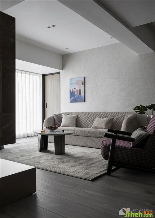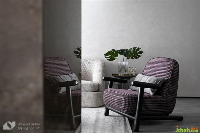The low furniture caters to the curved top surface in an enclosing posture, forming a harmonious interaction. The violet single sofa chair is uniquely elegant and romantic, leading the visual focus and setting off the advanced spatial temperament.