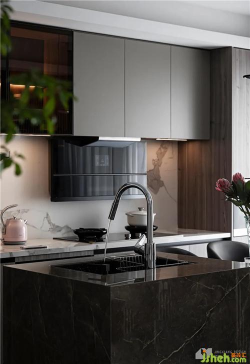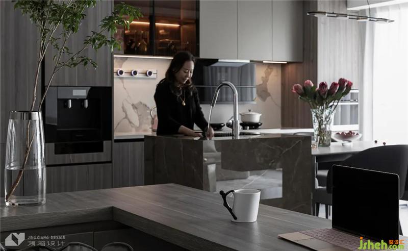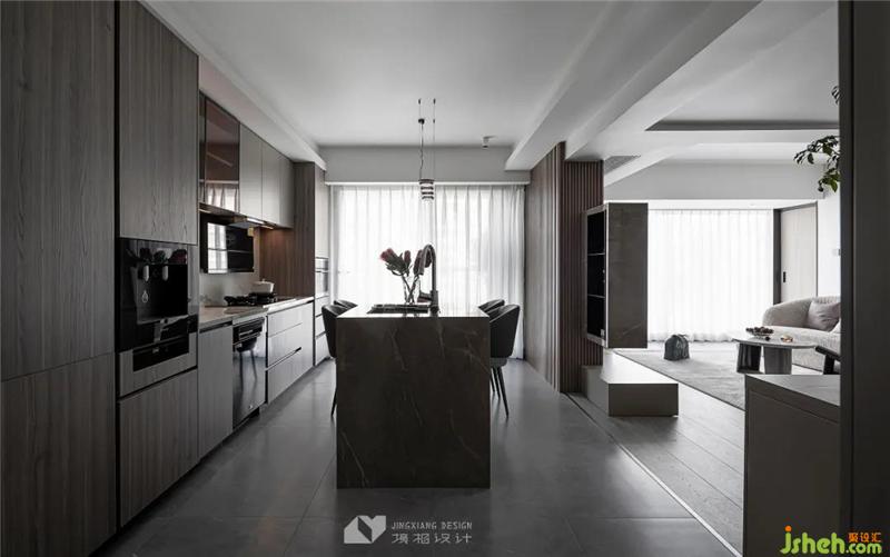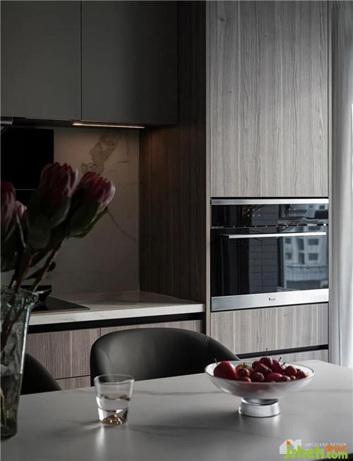 The natural wood grain is matched with the classic dark gray, which precipitates the steady texture of the space. The marble island connects the functional zones and maintains the interaction between family and pets, bringing a harmonious living experience.