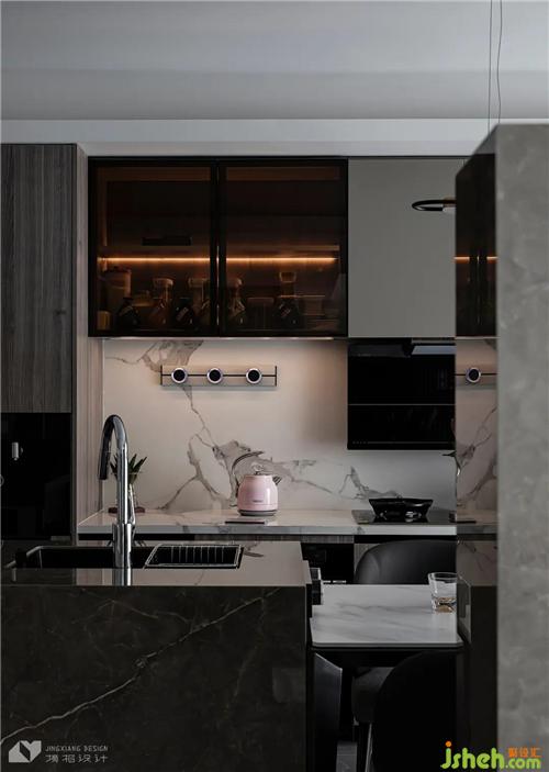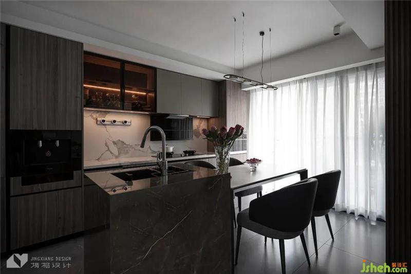 The open layout allows light and shadow to flow freely, and the space is more open and transparent. The high-pass cabinet extends from the entrance to the dining and kitchen area, which is atmospheric and regular, enhancing the linkage of space.