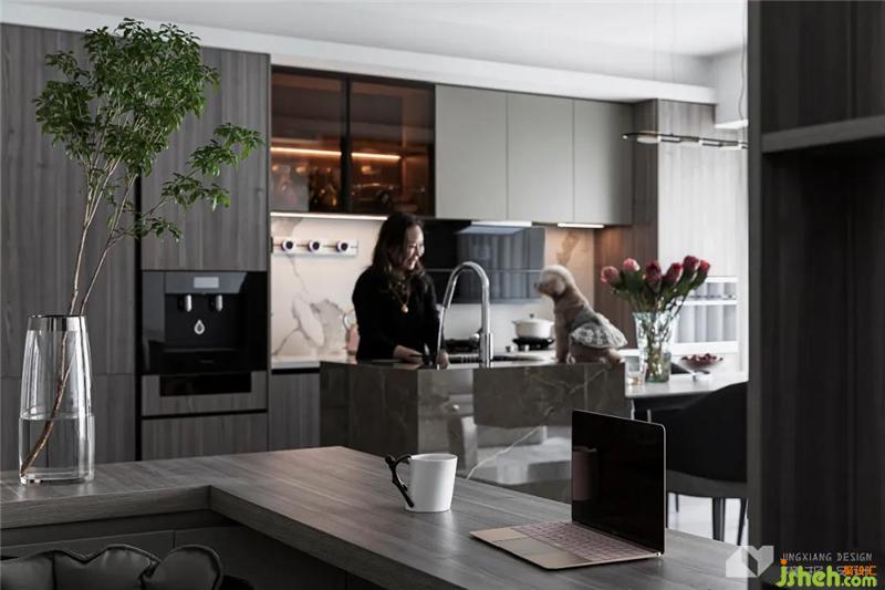 自然的木纹搭配经典的深灰色,沉淀出空间的稳重质感。大理石岛台勾连起功能分区,并维系着家人与宠物间的互动,带来和谐的人居体验。