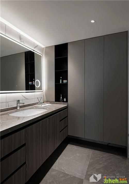 梳妆台与衣帽间共享空间,拓展主卧功能分区,升级套房体验。轻奢黄铜元素,跳脱出一众简约灰白材质,更添华丽质感。