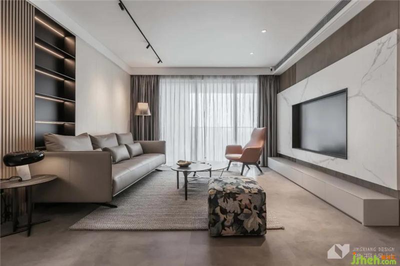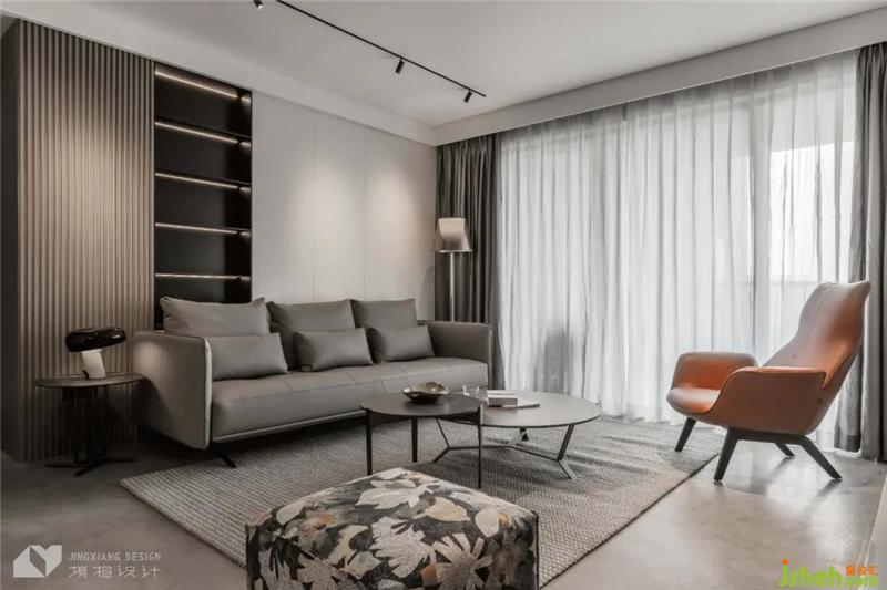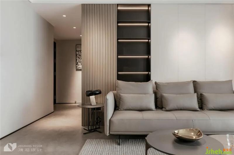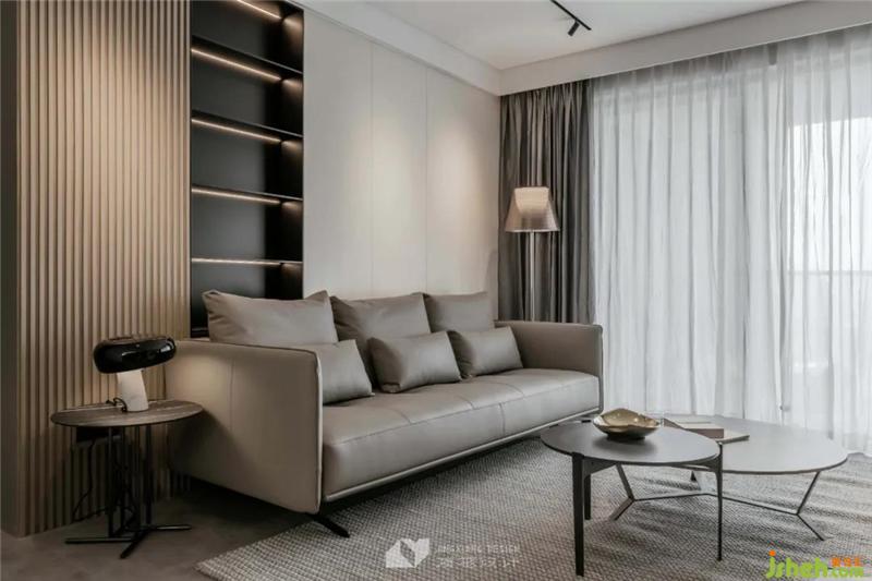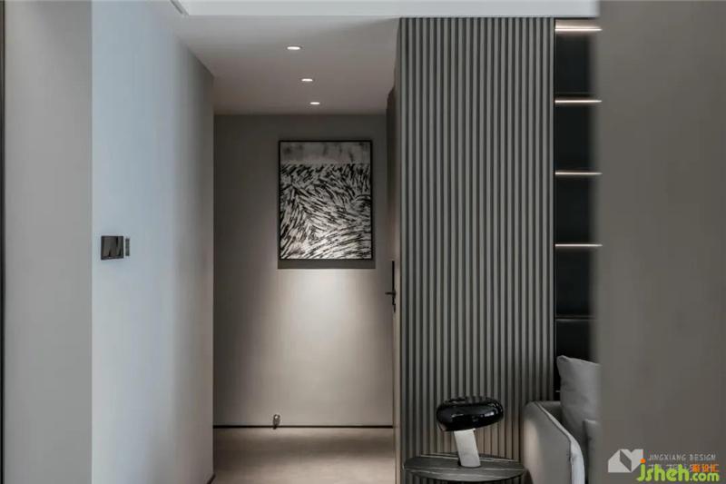 繁复的纹理、材质,分割出纯灰度空间的层次,光影交织、高柜俨然,引入归家仪式感。