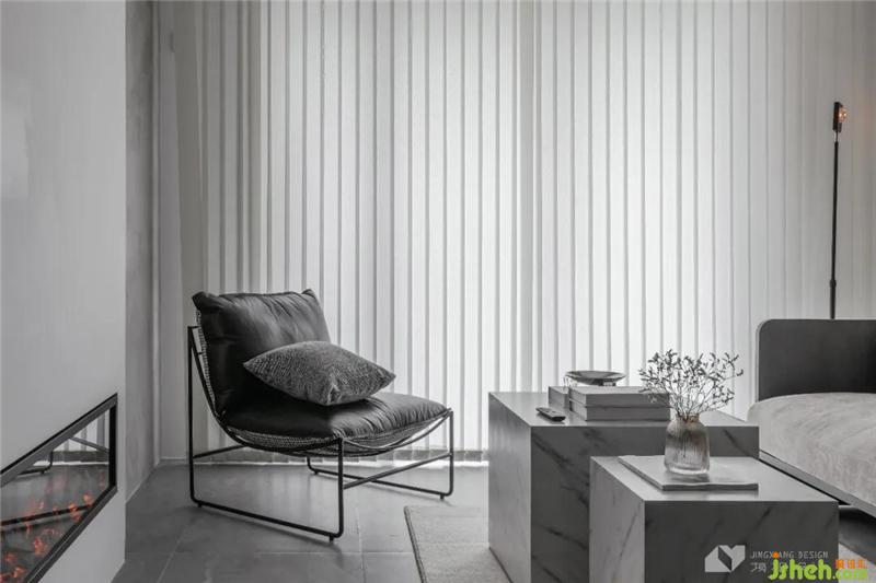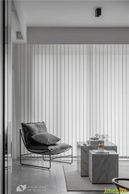客厅阳台布置洗衣机、烘干机,并设计出一个小吧台,一个空间,两种功能,用设计将室内的每一分空间利用到极致。经竖百叶过滤后的光线明媚柔和,自然光线晕染之下,客厅有了黑白胶片电影质感。简单的配色让空间故事感十足。搭上一张构架感十足的单人椅,放松闲坐时,静听光阴的故事。
