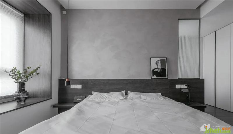 The walls of the master bedroom are still painted with industrial cement art paint, but as a rest space, there should be a trace of warmth besides the high cold. The wood floor with its own warm, let this space a little more warm.
