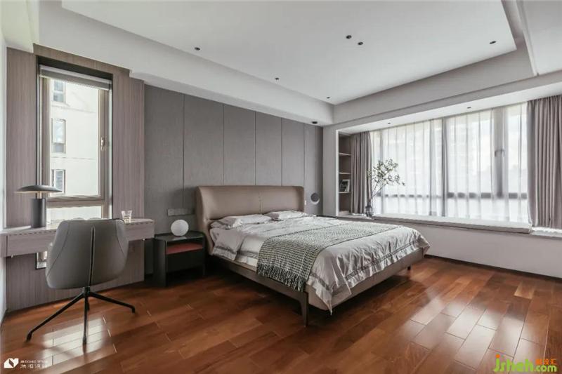 深色木地板自带古朴优雅气质,与温柔莫兰迪色家具对撞出时间静止领域,打造纯粹干净、温婉缱绻的睡眠空间。